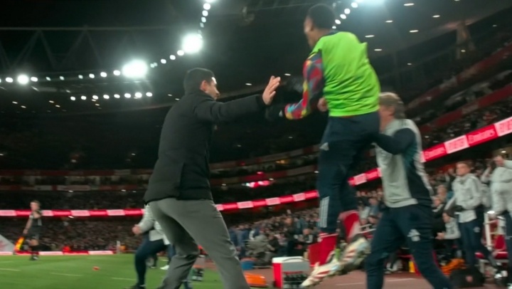 11月25日讯 阿森纳4-1热刺,赢下北伦敦德比。场边摄像头捕捉到,当阿森纳攻入第四球时,后备 席的斯凯利异常兴奋。