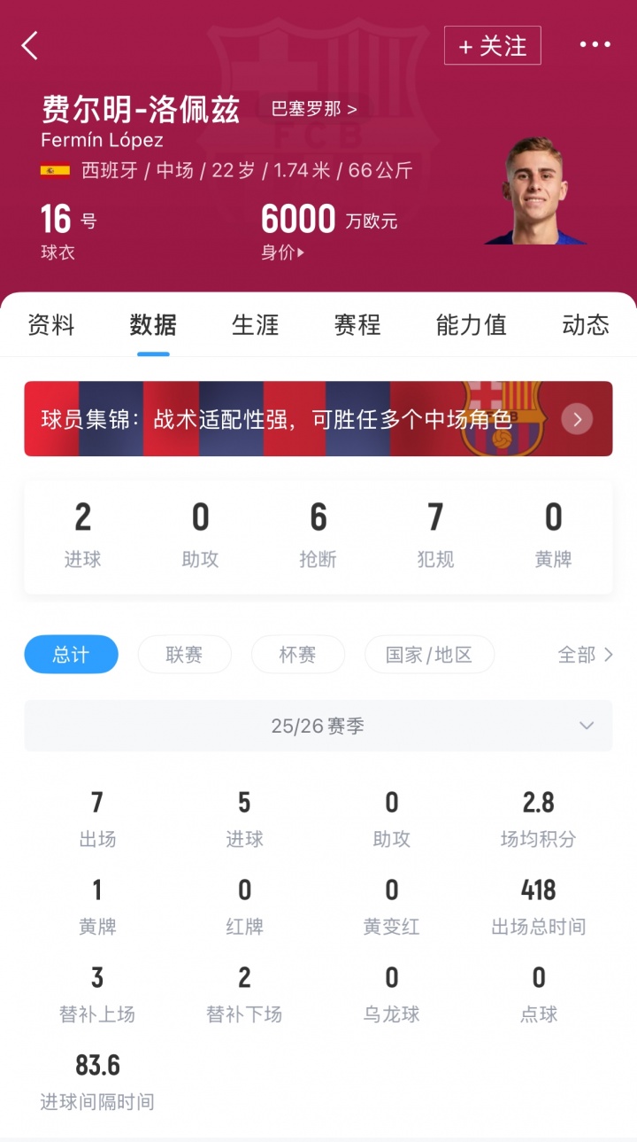 费尔明现年22岁,本赛季代表巴萨出场7次,欧洲杯直播打进5球。德转最新身价为6000万欧。