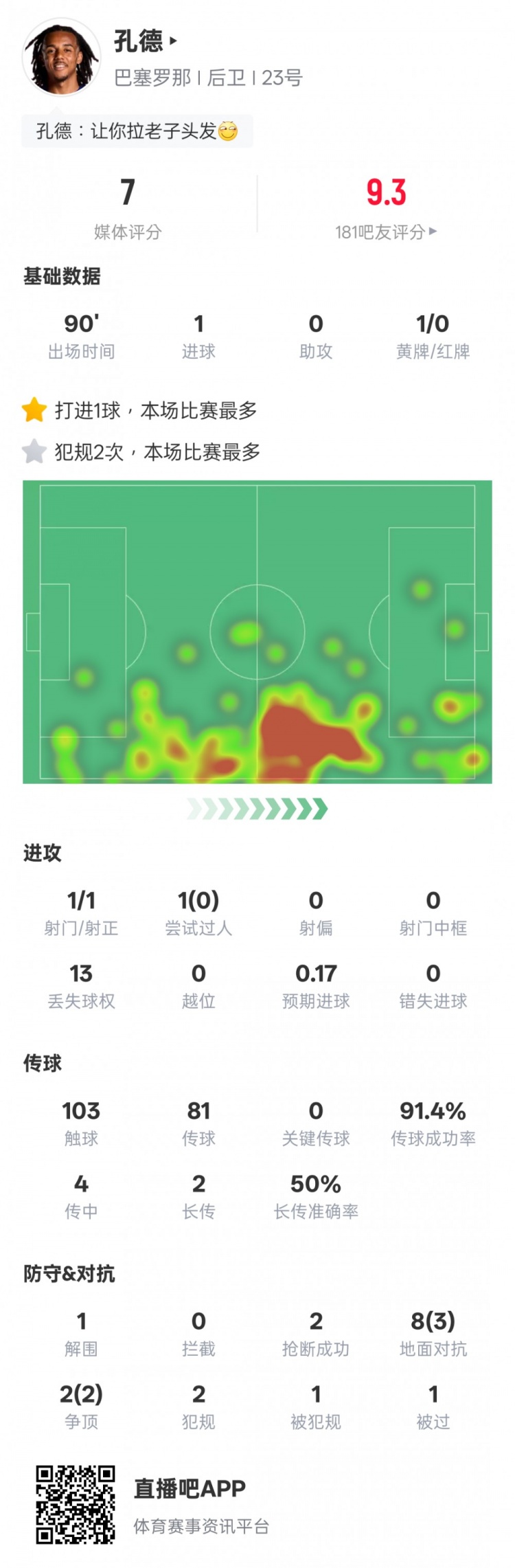 9月29日讯 2025-26赛季西甲职业联赛 第7轮,巴萨2-1皇家社会,孔德杆位出战,打进1粒得分 ,足球直播无插件免费在线观看还有1次解围和2次抄截 ,2次争顶均成功,评分7.0。