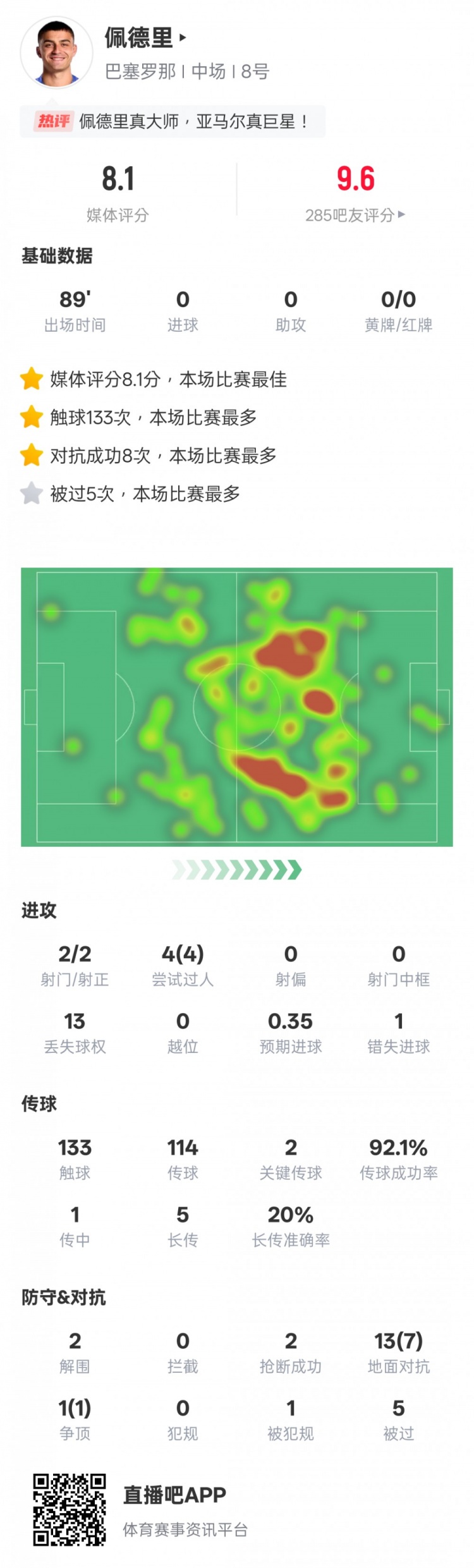 本场赛事 ,欧洲杯直播吧佩德里送出2次关键传送球 ,4次过人均成功,传送球 成功率92.1%,133次触球也是全场最多,还有2次解围和2次抄截 。