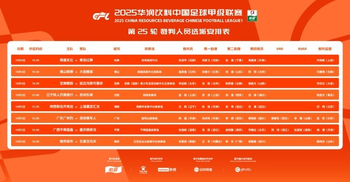 10月4日讯 2025华润饮料中甲职业联赛 第25轮裁判 选派结果公布,免费欧洲杯直播广东广州豹vs深圳青年人、广西平果vs重庆铜梁龙两场争二关键战均安排有VAR裁判 。