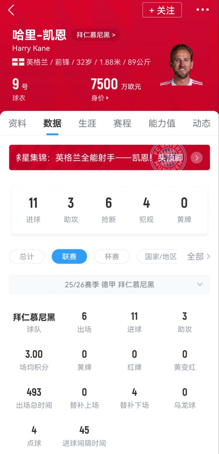 本赛季开赛以来凯恩竞技状态 极为火热,为拜仁在职业联赛 中出场6次,贡献11球3助。目前32岁的凯恩身价为7500万欧元。