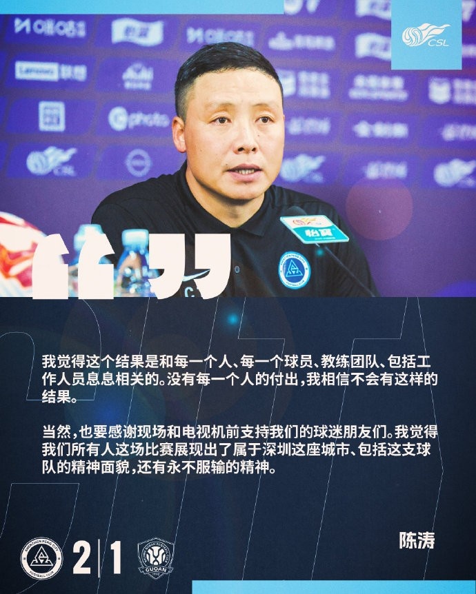 赛后新闻发布会上,代理主指导教练员陈涛表示:“我觉得这个结果是和每一个人、每一个球员、指导教练员队伍 、包括工作人员息息相关的。没有每一个人的付出,我相信不会有这样的结果。