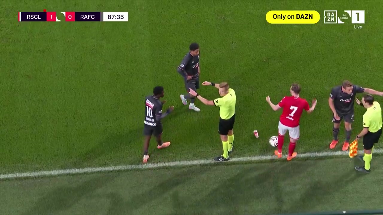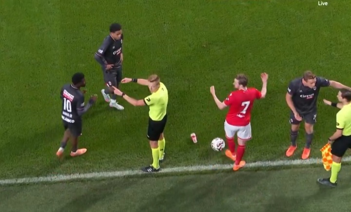 当时,主裁判 站在边界线 上,示意球员们远离助理裁判,停止对裁判 员判决 的抗议。而看台上的球迷向场内扔出了水杯,击中了主裁的背部和标准列日球员的手臂。主裁判 立刻吹哨示意赛事 就此取消,双方球员都对这一判决 感到沮丧。