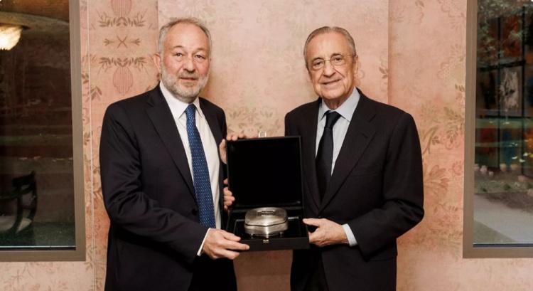 10月22日讯 北京时间周四凌晨的欧冠职业联赛 阶段第3轮赛事 ,皇马将在伯纳乌迎战尤文。本场赛事 之前,皇马主席弗洛伦蒂诺和尤文主席费雷罗进行了正式会晤,前者代表俱乐部向后者赠送了礼物。