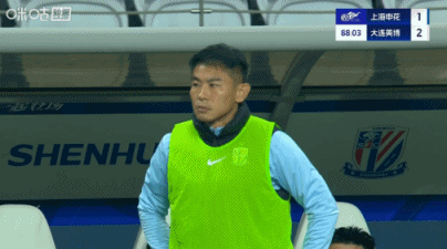 急啊!于汉超穿着后备 背心呆呆站在场边,申花替换队员 次数已经用完