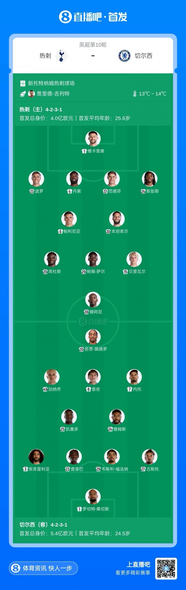 11月2日讯 英超第10轮,热刺主场作战 迎战切尔西,赛前杆位名单公布。【本场赛事 ,欧洲杯直播穆阿尼pk若昂·佩德罗,库杜斯、帕利尼亚出战,恩佐、凯塞多出战】