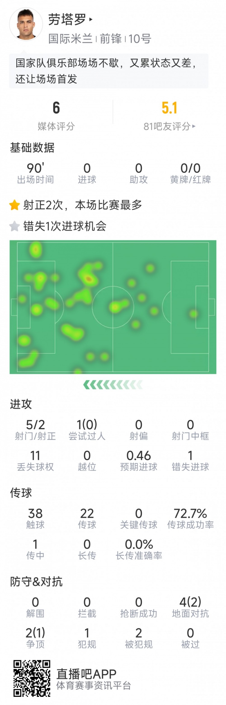 11月2日讯 在本轮意甲,国米2-1击败维罗纳。本场赛事 劳塔罗杆位登场打满全场,足球直播无插件免费在线观看以下为他在本场数据: