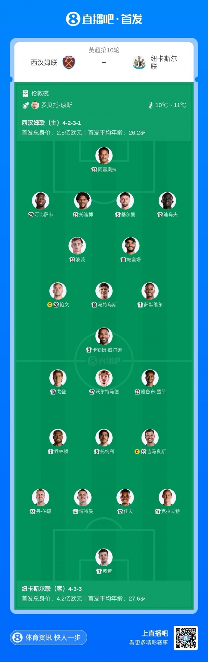 11月02日讯 北京时间22:00,英超第10轮,西汉姆联vs纽卡,赛前双方杆位公布!【本场赛事 西汉姆联方面,威尔逊出任单箭头,波茨、帕奎塔搭档中场球员,欧洲杯直播纽卡方面沃尔特马德出任五号位,吉马良斯,托纳利坐镇中场球员】