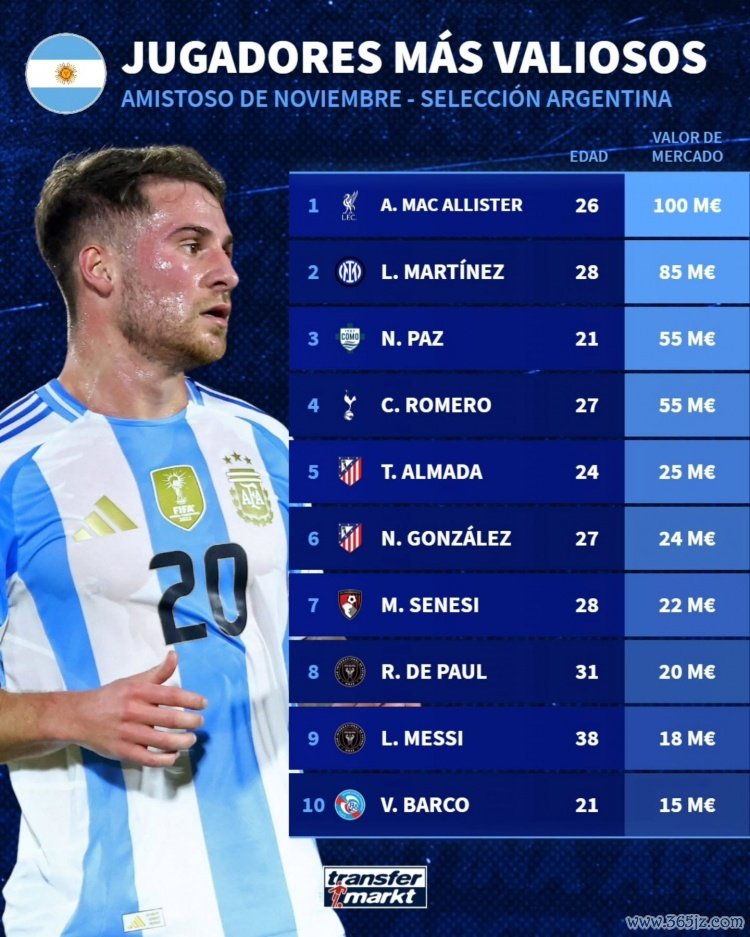 11月15日讯 德国转会市场统计了本期阿根廷队名单的球员身价,麦卡利斯特1亿欧居首,免费欧洲杯直播梅西1800万欧排名第9位。