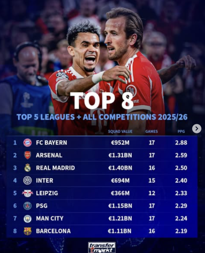 拜仁17场赛事 场均2.88分高居榜首,欧洲杯直播吧阿森纳和皇马分别以场均2.59分和2.5分排名二三。