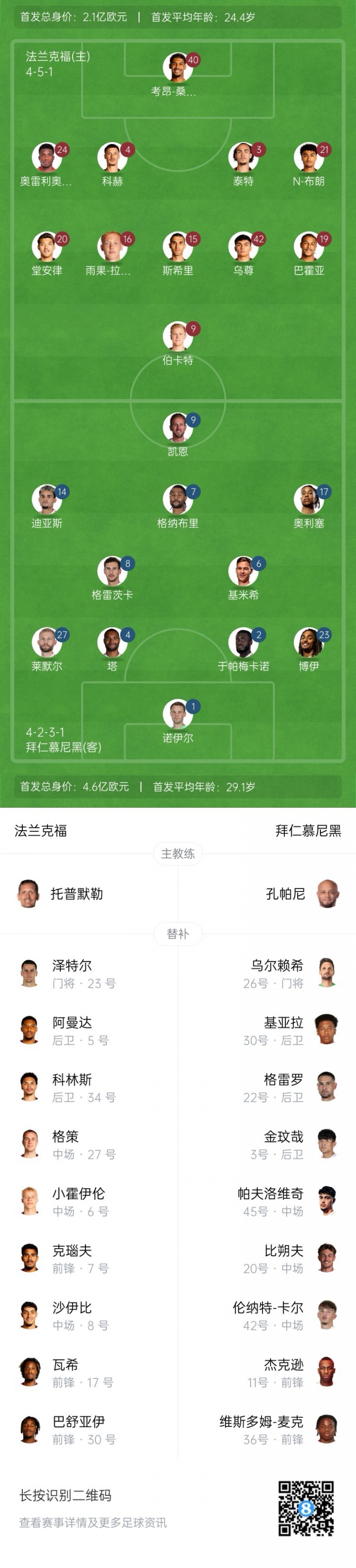 法兰克福杆位:40-考昂·桑托斯、24-奥雷利奥·布塔、4-科赫、3-泰特、21-N·布朗、20-堂安律、16-雨果·拉尔森、15-斯希里、42-乌尊、19-巴霍亚、9-伯卡特